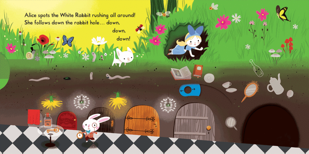 It features super cute illustrations by Colonel Moutarde, and the PULL, PUSH or SLIDE mechanism on every spread to bring the magical story to life.  This can be a perfect first introduction to Alice in Wonderland for young children.